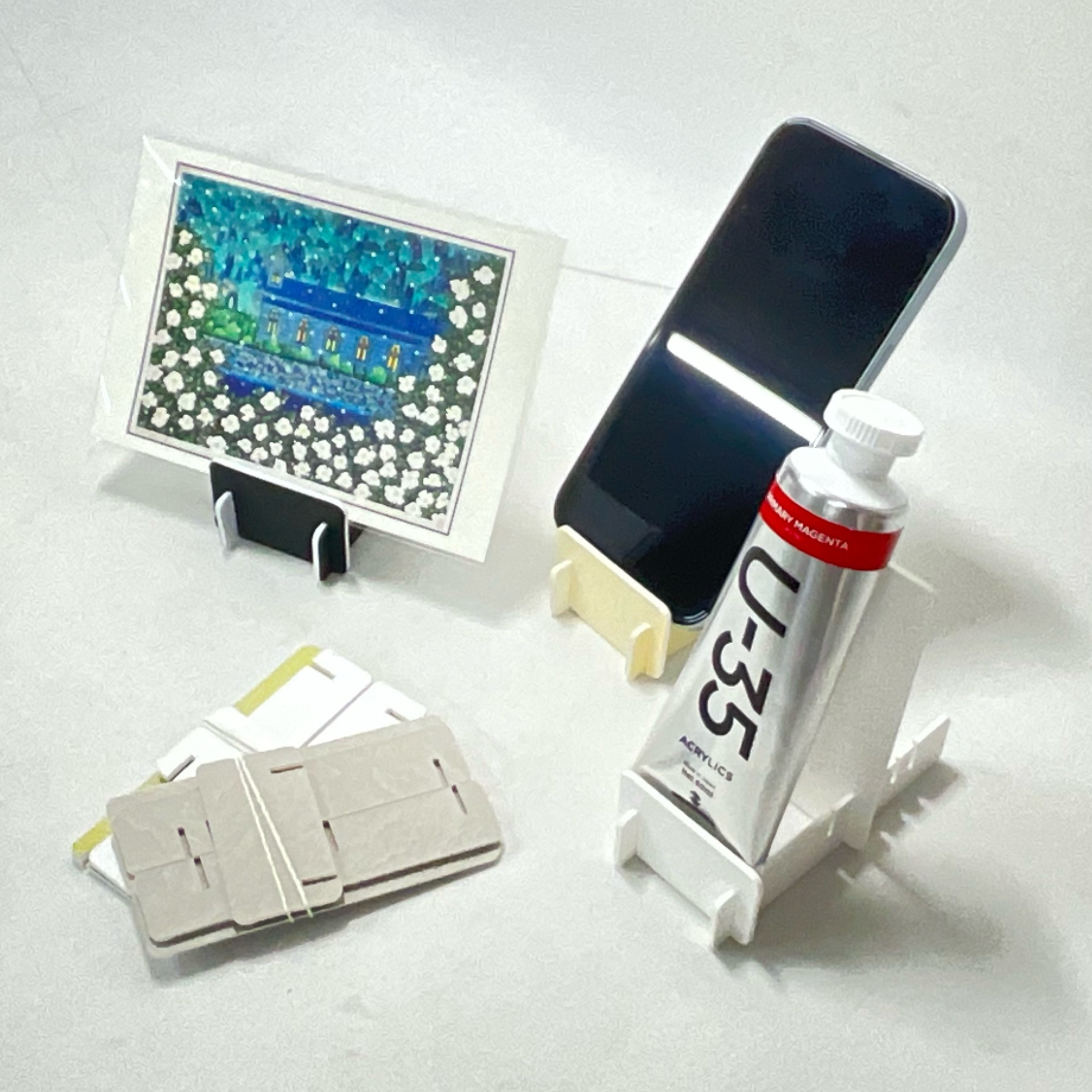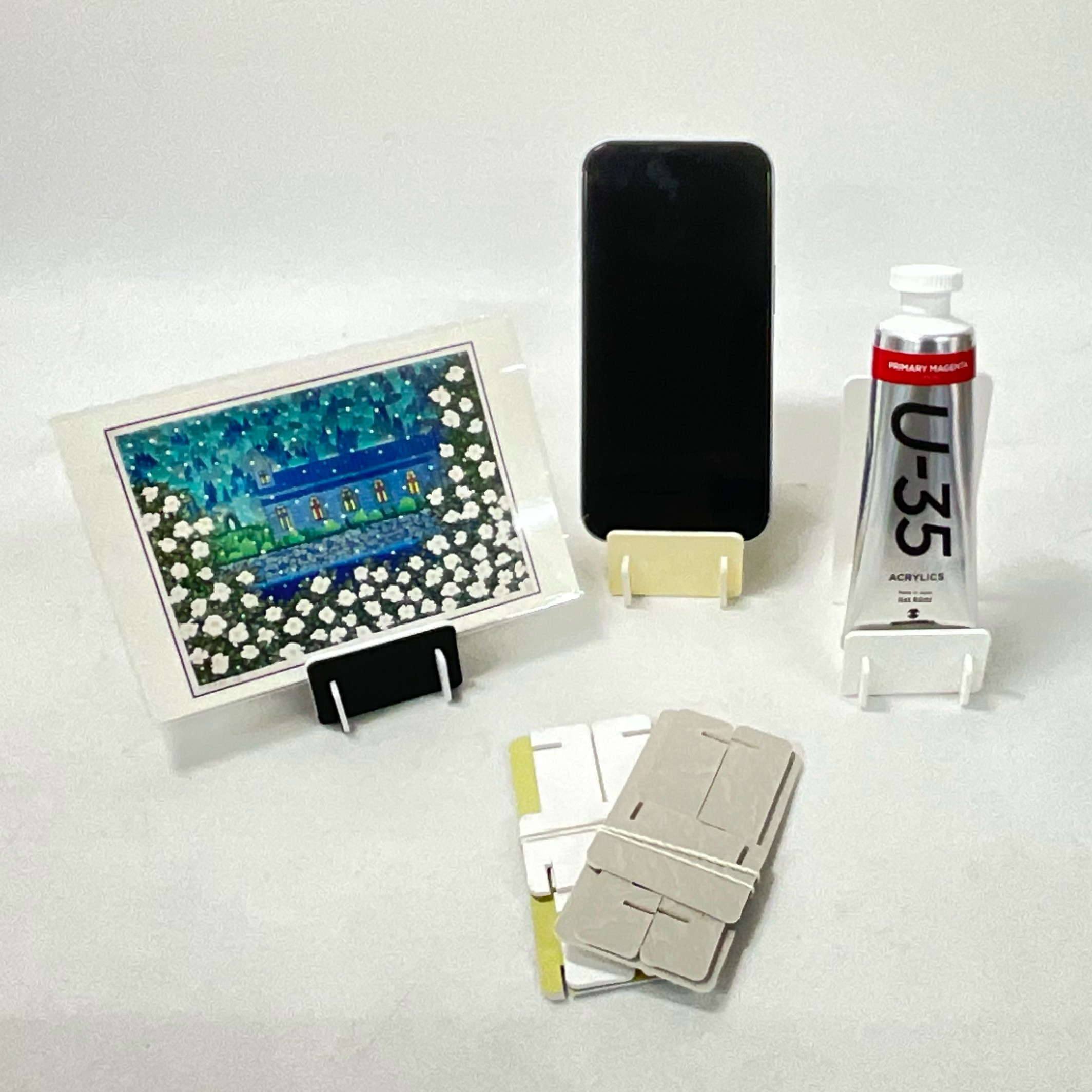 ハガキ、スマホ、絵具、名刺、CD、写真、立てたいもの、立てられるもの、立ててください。